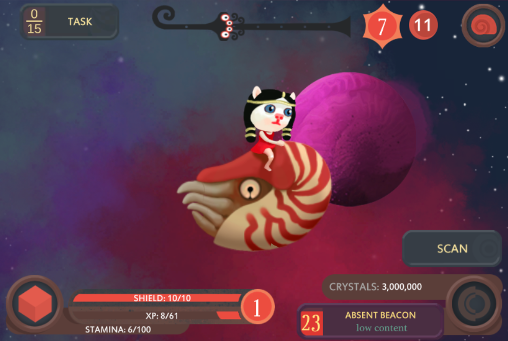 The game is designed to leverage a number of psychological hooks that would be suitable for monetisation. It features small procedural systems to generate planet names and randomise space backgrounds, driven by developed art assets.